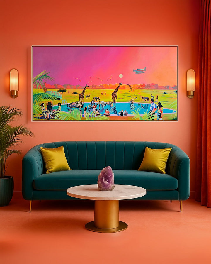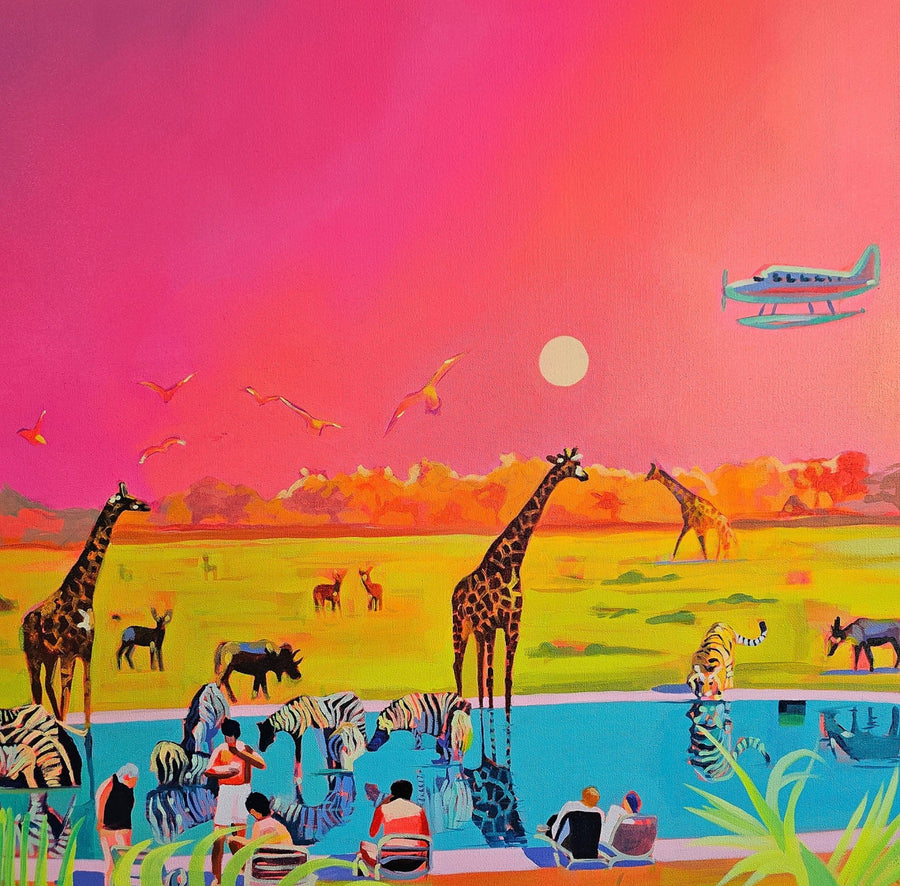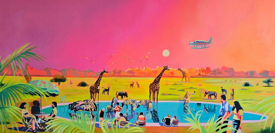 "Mirage is a vision of something too good to be true - a scene suspended between fantasy and reality. Painted in warm, hazy tones and vibrant, highly saturated colours, the piece glows with the heat of an imagined sun, filling the canvas with a sense of wonder and escape.At the centre, a pool becomes a meeting point for people and wildlife alike: giraffes and zebras lean in to drink alongside tigers, antelopes, and figures basking in the dreamy stillness of the moment. A small plane drifts across the horizon, while flocks of birds circle under a glowing sky, heightening the surreal atmosphere.This painting is about longing, imagination and that shimmering feeling of paradise glimpsed on the horizon. Like a mirage, it invites you closer, blurring the line between what is real and what is dreamed."